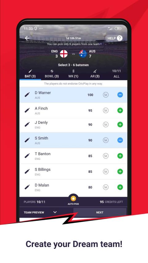 Pilih 11 pemain kriket favorit Anda dari kedua tim di bermain dalam pertandingan mendatang untuk membentuk tim fantasi Anda sendiri secara gratis. Jalani impian memiliki tim kriket.